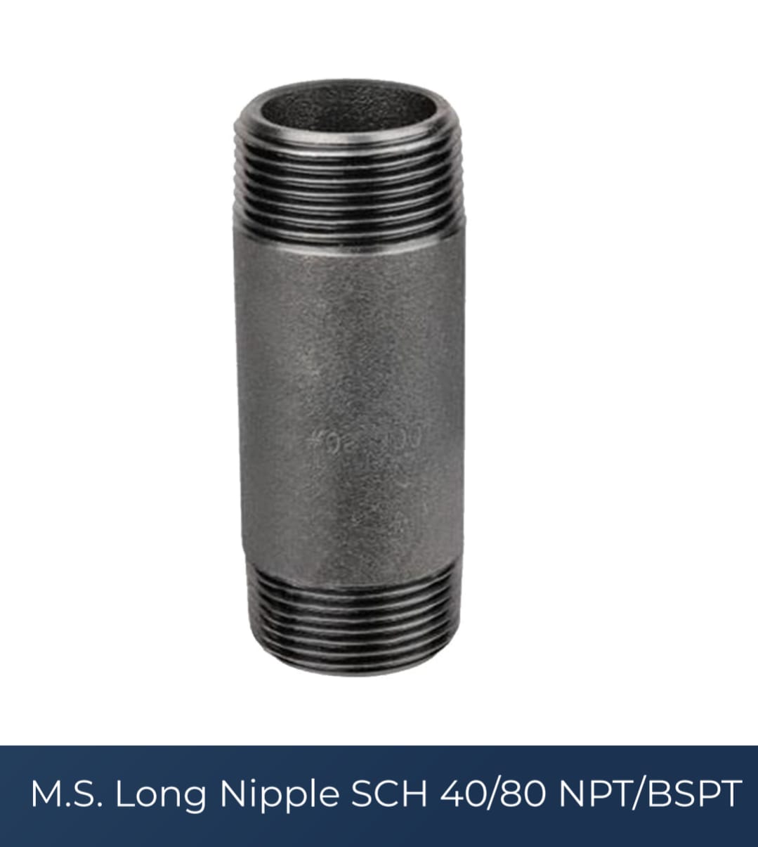 M.S. Long Nipple SCH 40/80 NPT/BSPT is a mild steel threaded pipe fitting used to extend or connect pipelines.