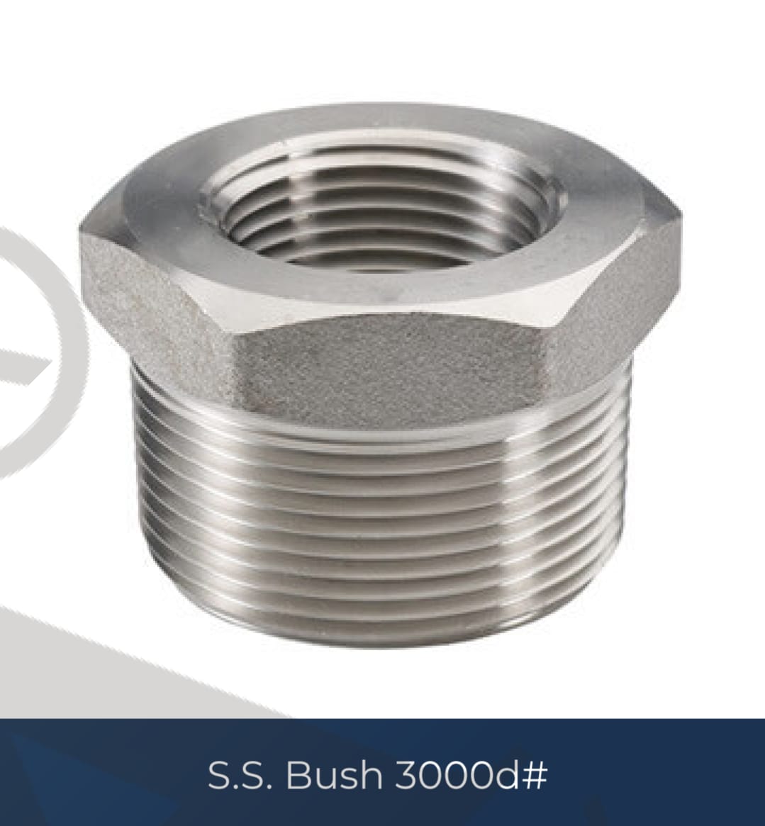 Stainless steel bush fittings rated at 3000# are used to connect pipes of different sizes in high-pressure systems.