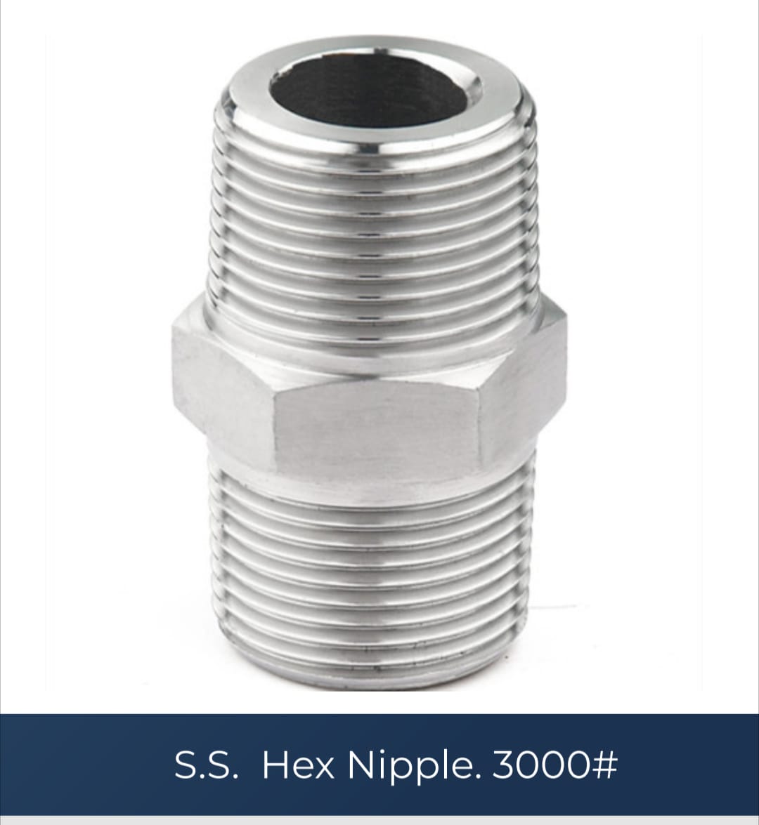 Stainless steel hex nipples rated at 3000# are used to connect two pipes or fittings with threaded ends.