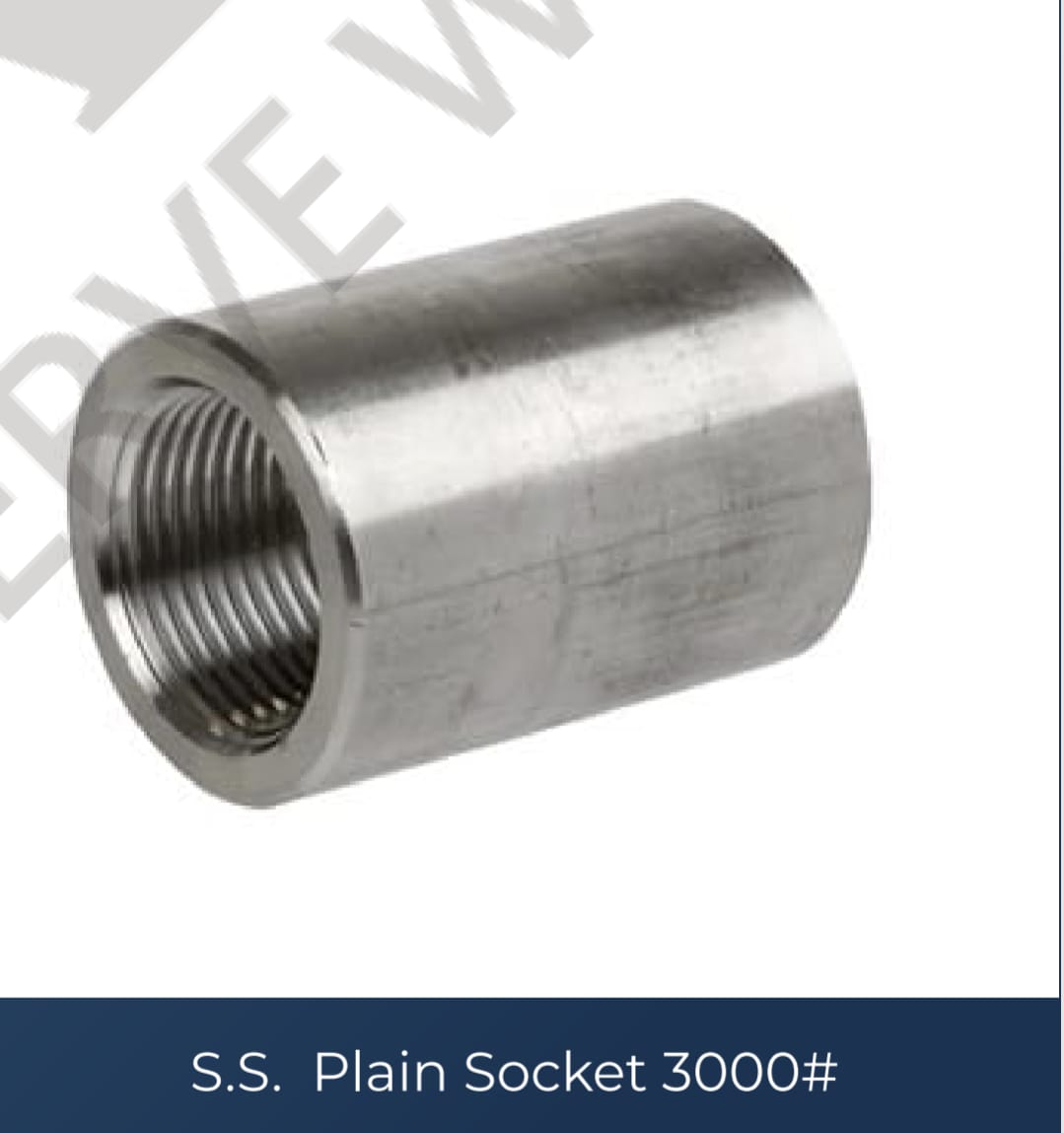 Stainless steel plain sockets rated at 3000# connect pipes in a straight line with strong threaded joints.