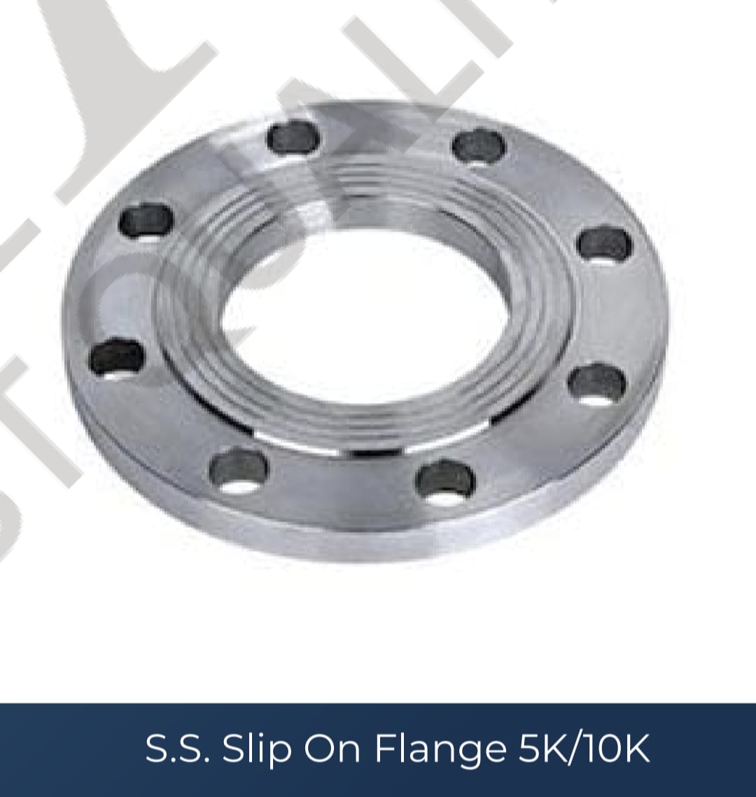 S.S. Slip-On Flange (5K/10K) is a stainless steel pipe fitting designed for easy installation by slipping over the pipe and welding.